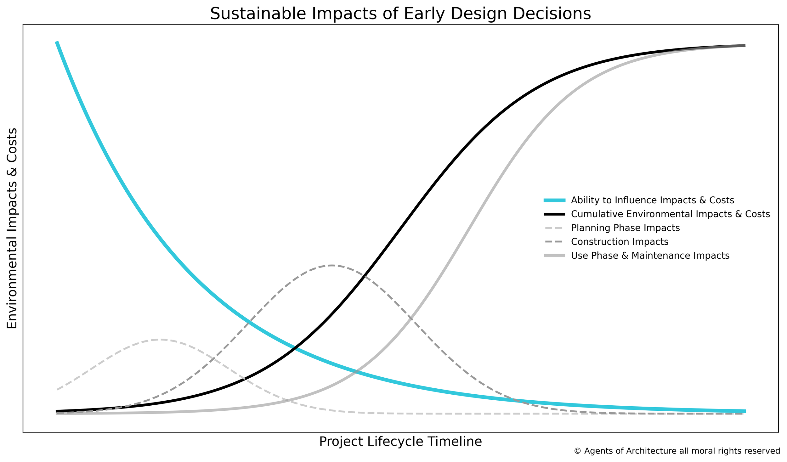 Early planning decisions have the greatest influence on environmental impact and cost outcomes. As a project progresses through construction and into use, the ability to influence performance decreases while cumulative impacts and costs continue to rise.